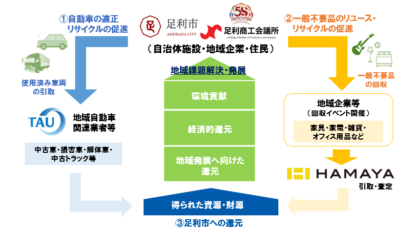 昨今、脱炭素社会の実現に向け、日本各地で循環型社会を目指したまちづくりの重要性が高まっています。足利市においても、2050年二酸化炭素実質排出量ゼロを目指す「ゼロカーボンシティ宣言」を表明しています。本連携は、この宣言の趣旨に基づき、不要品の回収・再資源化の推進および足利5S学校の取り組みの拡充を通じて、カーボンニュートラルと循環型社会の実現に貢献することを目的としています。さらに、リユース・リサイクルの促進やごみ処理費用の削減を図るとともに、得られた資源や財源を地域へ還元することで地域課題の解決に寄与し、限りある資源を大切に活用する人と文化を育むまちづくりに貢献してまいります。